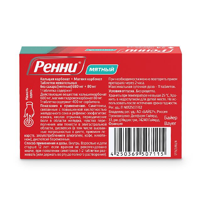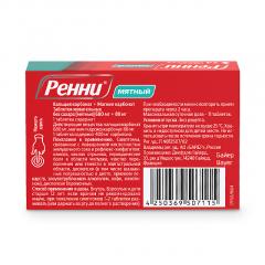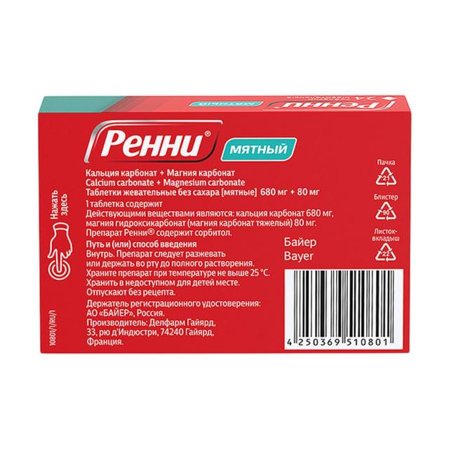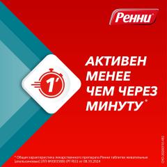 Антацидный препарат местного действия. Таблетка Ренни содержит антацидные вещества – кальция карбонат и магния карбонат, которые обеспечивают быструю и продолжительную нейтрализацию избыточной соляной кислоты желудочного сока, тем самым оказывая защитное действие на слизистую оболочку желудка. Достижение положительного эффекта в течение 3–5 минут обусловлено хорошей растворимостью таблеток и высоким содержанием кальция.