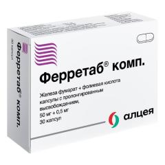 железа фумарат 163.56 мг, эквивалентно 152.1 мг сухого вещества, эквивалентно содержанию железа 50 мг, фолиевая кислота (вит. Bc) 0.54 мг, эквивалентно 0.5 мг сухого вещества Вспомогательные вещества: минитаблетки железа фумарата: лактозы моногидрат - 3.42 мг, кремния диоксид коллоидный - 0.6 мг, магния стеарат - 0.6 мг, сополимер метилметакрилата и этилакрилата [2:1] - 4.66 мг; минитаблетка фолиевой кислоты: лактозы моногидрат - 24.21 мг, целлюлоза микрокристаллическая - 24.25 мг, кремния диоксид коллоидный - 0.5 мг, магния стеарат - 0.5 мг.