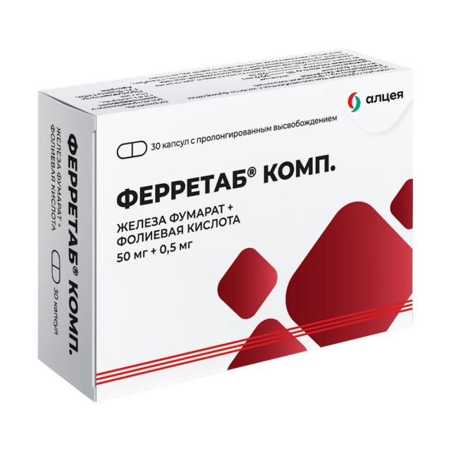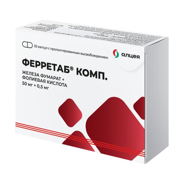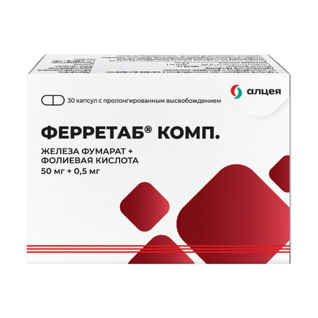 железа фумарат 163.56 мг, эквивалентно 152.1 мг сухого вещества, эквивалентно содержанию железа 50 мг, фолиевая кислота (вит. Bc) 0.54 мг, эквивалентно 0.5 мг сухого вещества Вспомогательные вещества: минитаблетки железа фумарата: лактозы моногидрат - 3.42 мг, кремния диоксид коллоидный - 0.6 мг, магния стеарат - 0.6 мг, сополимер метилметакрилата и этилакрилата [2:1] - 4.66 мг; минитаблетка фолиевой кислоты: лактозы моногидрат - 24.21 мг, целлюлоза микрокристаллическая - 24.25 мг, кремния диоксид коллоидный - 0.5 мг, магния стеарат - 0.5 мг.