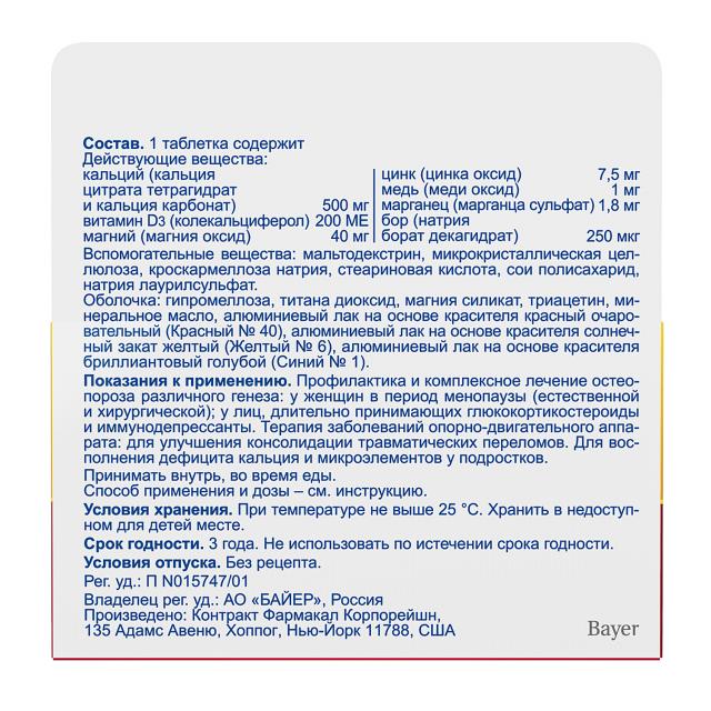 Кальций - 500 мг (кальция цитрат и кальция карбонат), Витамин D3 - 200 МЕ, магний - 40 мг (магния оксид), цинк - 7,5 мг (цинка оксид), медь - 1 мг (меди оксид), марганец - 1,8 мг (марганца сульфат), бор - 250 мкг (натрия борат).