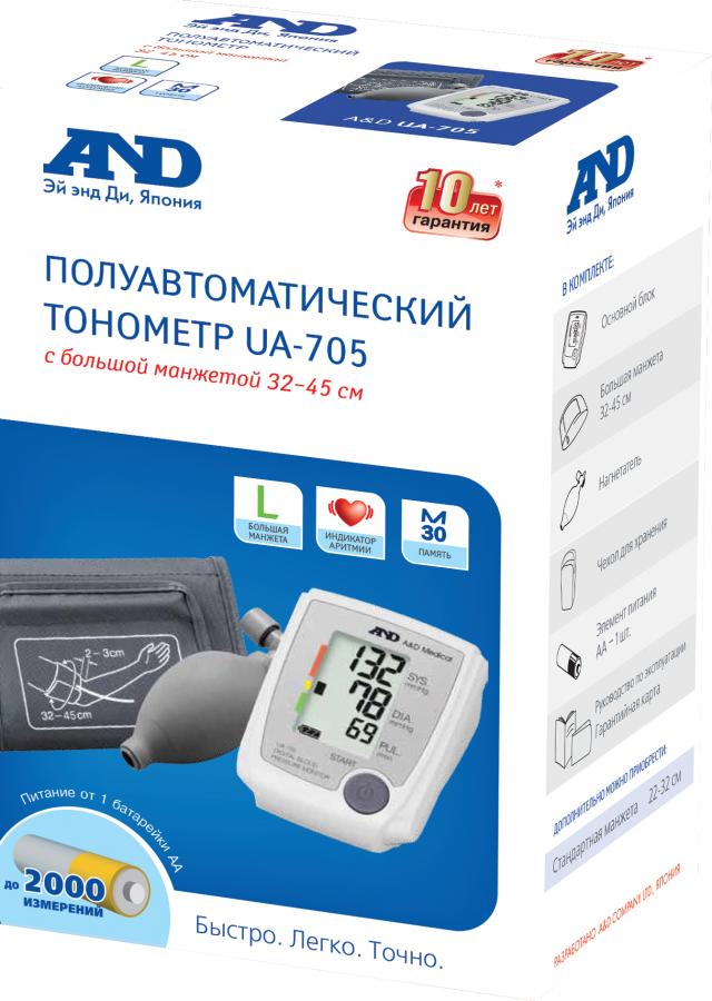 AND UA-705 – самый функциональный полуавтоматический тонометр. Его легкий изящный корпус вмещает в себя большой трехстрочный дисплей и все необходимые для диагностики давления функции. Он подойдет тем, кому хочется использовать последние достижения медицинских технологий, но желает сэкономить при этом.
