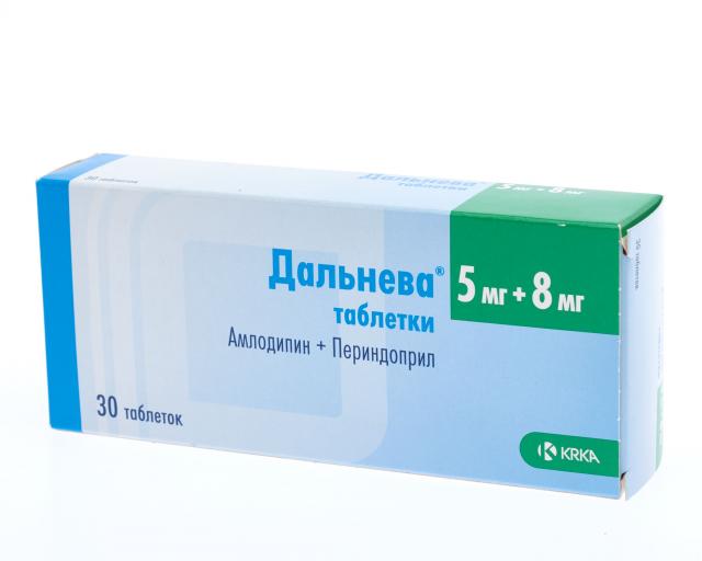 Информация о передозировке препаратом Дальнева отсутствует. Периндоприл.Данные о передозировке периндоприлом ограничены. Симптомы: выраженное снижение АД, шок, нарушения водно-электролитного баланса, почечная недостаточность, гипервентиляция легких, тахикардия, ощущение сердцебиения, брадикардия, головокружение, беспокойство и кашель. Лечение: меры неотложной помощи сводятся к выведению препарата из организма: промыванию желудка и/или назначению активированного угля с последующим восстановлением ОЦК. При выраженном снижении АД следует перевести пациента в положение «лежа» на спине с приподнятыми ногами, при необходимости провести мероприятия по восстановлению ОЦК (например, внутривенная инфузия 0,9% раствором натрия хлорида). Также возможно внутривенное введение катехоламинов. С помощью гемодиализа можно удалитьпериндоприл из системного кровотока. При брадикардии, резистентной к терапии, может потребоваться установка искусственного водителя ритма. Необходим динамический контроль общего состояния, концентрации креатинина и электролитов в плазме крови. Амлодипин. Информация о передозировке амлодипином ограничена. Симптомы: выраженное снижение АД свозможным развитием рефлекторной тахикардии и чрезмерной периферическойвазодилатации (риск развития выраженной и стойкой артериальной гипотензии, в т.ч. с развитием шока и летального исхода). Лечение: промывание желудка, назначение активированного угля (особенно в первые 2ч после передозировки), поддержание функции сердечно-сосудистой системы, возвышенное положение нижних конечностей, контроль ОЦК и диуреза, симптоматическая и поддерживающая терапия. Для восстановления тонуса сосудов - применение сосудосуживающих средств (при отсутствии противопоказаний к их применению); для устранения последствий блокады кальциевых каналов - внутривенное введение раствора кальция глюконата. Гемодиализ неэффективен.