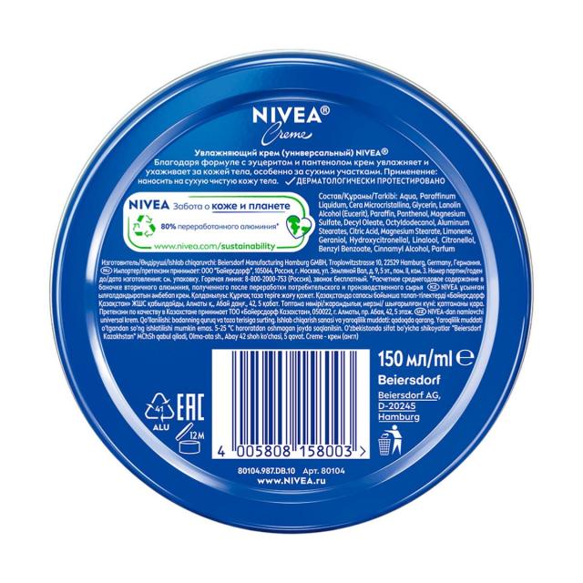 NIVEA CREME эффективно ухаживает за кожей лица, рук и тела. Благодаря формуле с эуцеритом и Пантенолом крем увлажняет и ухаживает за кожей тела, особенно сухими участками. За счет плотной густой текстуры крем усиливает барьерные свойства кожи. Подходит для лица, рук и тела. Подходит для всех типов кожи.