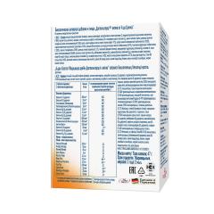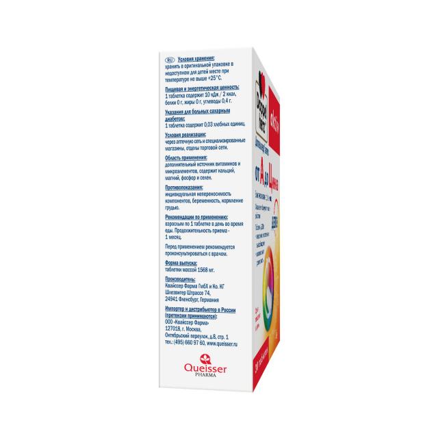 Состав: кальция (кальций) фосфат (фосфор), лактозы моногидрат, L-аскорбиновая кислота (витамин С), гидроксипропилметилцеллюлоза (загуститель), магния оксид (магний), крахмал, никотинамида аскорбат (никотинамид), DL-альфа-токоферола-ацетат (витамин Е), цинка глюконат (цинк), диоксид кремния аморфный (агент антислеживающий), моно- и диглицериды жирных кислот (эмульгатор), цитрат калия 3-замещенный (стабилизатор), гидроксипропилметилцеллюлоза (загуститель), D-пантотенат кальция, соли кальция жирных кислот (стабилизатор), поливинилпирролидон (стабилизатор), шеллак (глазирователь), диоксид титана (краситель), железа-(II)-фумарат (железо), пиридоксина гидрохлорид (витамин В6), витамин А, тальк (агент антислеживающий), тиамина нитрат (витамин В1), рибофлавин (витамин В2), цианокобаламин (витамин В12), марганца сульфат (марганец), меди-(II)-сульфат (медь), холекальциферол (витамин D3), глицерин (загуститель), железа оксид красный (краситель), вода, Твин 80 (эмульгатор), фолиевая кислота, фитоменадион (витамин К), хрома-(III)-хлорид (хром), калия йодид (йод), биотин, натрия молибдат (молибден), натрия селенат (селен).