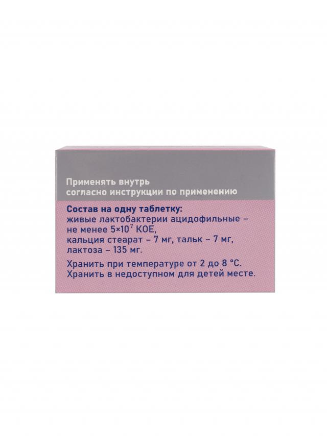 Одна таблетка содержит не менее 10 живых лактобактерий ацидофильных в 1 дозе, вспомогательные вещества - лактоза, кальция стеарат, тальк.