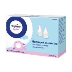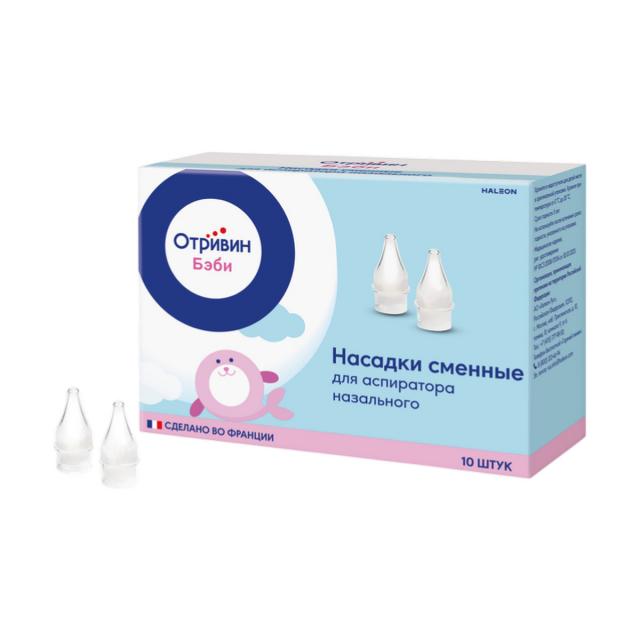 Hасадки cменные для назального аспиратора Отривин Бэби в количестве 10 штук вместе с инструкцией по применению помещают в картонную пачку.