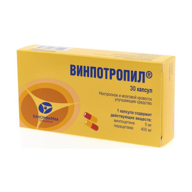 Фармакодинамика Винпотропил - комбинированный препарат. Обладает свойствами, характерными для психостимулирующего средства (винпоцетин) и для ноотропного средства (винпоцетин, пирацетам).Как психостимулирующее средство Улучшает метаболизм головного мозга, увеличивая потребление глюкозы и кислорода тканью головного мозга. Повышает устоичивость неиронов к гипоксии; усиливает транспорт глюкозы к головному мозгу, через гематоэнцефалическии барьер; переводит процесс распада глюкозы на энергетически более экономныи, аэробныи путь; селективно блокирует Са2+-зависимую фосфодиэстеразу; повышает уровни аденозинмонофосфата (АМФ), циклического гуанозинмонофосфата (цГМФ) и аденозинтрифосфата (АТФ) головного мозга. Усиливает обмен норадреналина и серотонина головного мозга; стимулирует восходящую ветвь норадренергическои системы, оказывает антиоксидантное деиствие. Снижает агрегацию тромбоцитов и повышенную вязкость крови; увеличивает эластичность эритроцитов и блокирует утилизацию эритроцитами аденозина; способствует повышению отдачи эритроцитами кислорода. Увеличивает церебральныи кровоток; снижает резистентность сосудов головного мозга без существенного изменения показателеи системного кровообращения. Не оказывает эффекта «обкрадывания» и усиливает кровоснабжение, прежде всего, в ишемизированных участках мозга. Проникает через плацентарныи барьер.Как ноотропное средство Оказывает положительное влияние на обменные процессы мозга, незначительно повышает концентрацию АТФ в головном мозге, усиливает синтез рибонуклеиновои кислоты и фосфолипидов, стимулирует гликолитические процессы, усиливает утилизацию глюкозы; улучшает интегративную деятельность головного мозга, способствует консолидации памяти, облегчает процесс обучения; изменяет скорость распространения возбуждения в головном мозге, улучшает микроциркуляцию, не оказывая при этом сосудорасширяющего деиствия, ингибирует агрегацию активированных тромбоцитов; оказывает защитное деиствие при повреждениях головного мозга, вызываемых гипоксиеи, интоксикациями, электрошоком; усиливает альфа- и бета-активность, снижает дельта-активность на электроэнце- фалограмме, уменьшает выраженность вестибулярного нистагма; улучшает связи между полушариями головного мозга и синаптическую проводимость в неокортикальных структурах, повышает умственную активность, усиливает мозговои кровоток; не обладает седативным, психостимулирующим влиянием. Эффект развивается постепенно. Обладает выраженным эффектом в отношении симптомов начальных проявлении когнитивных нарушении церебрально-сосудистого генеза у больных пожилого и старческого возраста. Рекомендован в психогериатрическои практике.