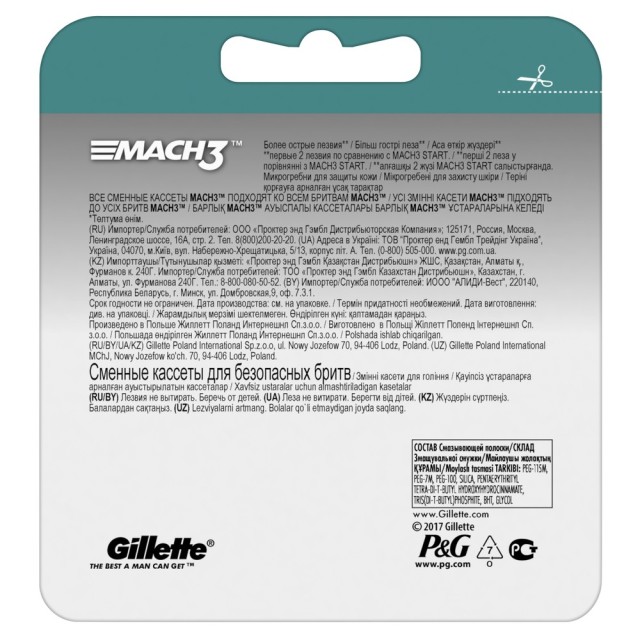 Сменные кассеты для мужской бритвы Gillette Mach3 оснащены лезвиями прочнее, чем сталь, которые дольше сохраняют остроту (по сравнению с Sensor3). Более острые режущие лезвия (первые 2 лезвия по сравнению с Sensor3) рассчитаны на 15 процедур комфортного бритья. Эта бритва Gillette оснащена смазывающей полоской, которая скользит по коже, предотвращая ее покраснение, а защитный микрогребень Skin Guard растягивает кожу и подготавливает волоски к сбриванию. К мужской бритве Mach3 подходят все сменные кассеты Mach3.