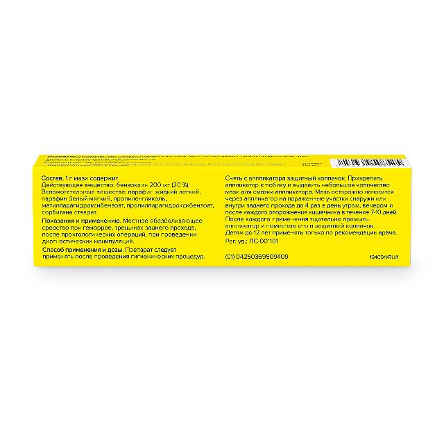 Местное обезболивающее средство при геморрое, трещинах заднего прохода, после проктологических операций, при проведении диагностических манипуляций.