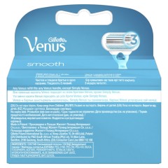Gillette Venus Smooth — это первые сменные кассеты с тремя лезвиями, созданные специально для женщин. Благодаря трем повторяющим изгибы тела лезвиям и разглаживающим кожу защитным подушечкам вокруг лезвий кассеты обеспечивают гладкое и чистое бритье одним движением. Голубая полоска-индикатор меняет цвет, сообщая о том, когда пора менять лезвия Venus для обеспечения оптимального качества бритья.