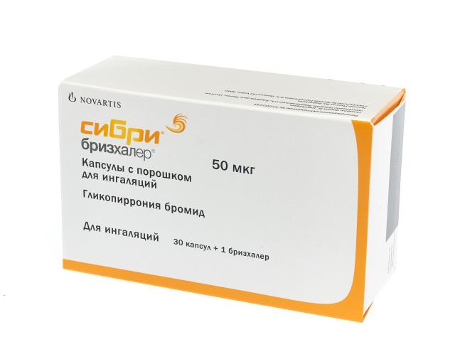 Препарат Сибри® Бризхалер®- ингаляционный длительно действующий препарат. Гликопиррония бромид - (м-холиноблокатор), механизм действия которого основан на блокировании бронхоконстрикторного действия ацетилхолина на гладкомышечные клетки дыхательных путей, что приводит к бронходилатирующему эффекту. В организме человека выявлено 5 подтипов мускариновых рецепторов (M1-5). Известно, что только подтипы М1-3 задействованы в физиологической функции дыхательной системы.