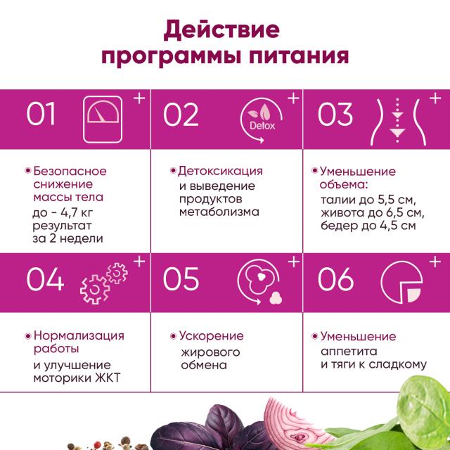 * Согласно отчета о клиническом исследовании при употреблении программы питания в течение 14 дней. Результаты могут отличаться в зависимости от индивидуальных особенностей организма и исходной массы тела