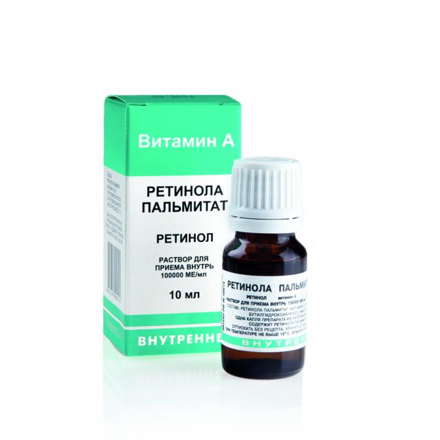 В 1 мл раствора содержится 100000 МЕ ретинола пальмитата (1 капля препарата из капельницы или глазной пипетки содержит ретинола пальмитата около 3 300 МЕ). 1 мг ретинола пальмитата соответствует 1817 МЕ.