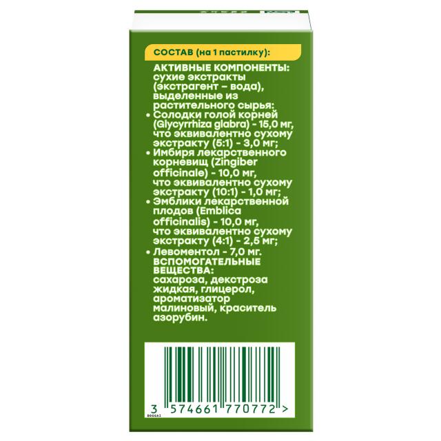 Комбинированный препарат растительного происхождения с противовоспалительным и отхаркивающим действием. Действие препарата обусловлено свойствами входящих в его состав компонентов. Экстракт корней солодки голой обладает противовоспалительным, отхаркивающим, спазмолитическим действием; экстракт корневища имбиря лекарственного оказывает противовоспалительное и болеутоляющее действие; экстракт эмблики лекарственной – противовоспалительное и жаропонижающее действие. Входящий в состав препарата ментол оказывает спазмолитическое, антисептическое действие.