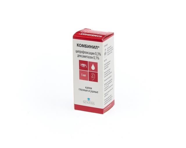 Комбинил-Дуо предназначен для местного использования в офтальмологической и оториноларингологической практике.Терапевтический эффект препарата Комбинилв-Дуо обусловлен антимикробным действием ципрофлоксацина и противовоспалительным действием дексаметазона. Ципрофлоксацин - противомикробный препарат из группы фторхинолонов, обладает широким спектром антибактериального действия, оказывает бактерицидный эффект. Спектр антибактериального действия ципрофлоксацина включает грамотрицатепьные микроорганизмы: Esherichia со I i, Salmonella spp., Shigella spp., Proteus spp. (индолположительный и индолотрицательный), Morganella morganii, Citrobacter spp., Klebsiella spp., Enterobacter spp., Vibrio spp., Campylobacter spp., Hafnia spp., Provideneia stuartii, Haemophilus influenzae, Pasteurella multocida, Pseudomonas spp., Gardnerella spp., Legionella pneumophila. Neisseria spp., Moraxella catarrhalis, Acinetobacter spp., Brucella spp., Chlamidia spp. К ципрофлоксацину чувствительны также грамположительные микроорганизмы: Staphylococcus spp., Streptococcus pyogenes, St. agaJactiae, Corynebacterium diphtheriae, Listeria monocitogenes. Препарат малотоксичен. Дексаметазон - синтетический глюкокортикостероид, преимущественно используемый в качестве противовоспалительного и иммуносупрессивного агента. При местном применении терапевтическая активность дексаметазона обусловлена противовоспалительным, противоаллергическим и антипролиферативным действием. Он уменьшает проницаемость и пролиферацию капилляров, локальную экссудацию, клеточную инфильтрацию, фагоцитарную активность, отложение коллагена и активность фибробластов, угнетает образование рубцовой ткани. Таким образом, дексаметазон уменьшает основные симптомы воспаления. Ципрофлоксацин хорошо проникает в различные ткани глаза, за исключением хрусталика. Наблюдается системная реабсорбция. Дексаметазон после закапывания в конъюнктивальный мешок хорошо проникает в эпителий роговицы и конъюнктиву; при этом в водянистой влаге глаза достигаются терапевтические концентрации; при воспалении или повреждении слизистой оболочки скорость пенетрации увеличивается. При применении в оториноларингологической практике при введении фиксированной комбинации ципрофлоксацина и дексаметазона в слуховой проход максимальная сывороточная концентрация для ципрофлоксацина составляет 1,55 нг/л, а для дексаметазона 0,86 нг/л. Время полувыведения препаратов - 2,9 часа и 2,8 часа соответственно. Входящий в состав препарата в качестве вспомогательного компонента гидроксипропилбетациклодекстрин способствует длительному сохранению активного вещества на передней поверхности глаза, увеличивая тем самым эффективность и длительность действия препарата.