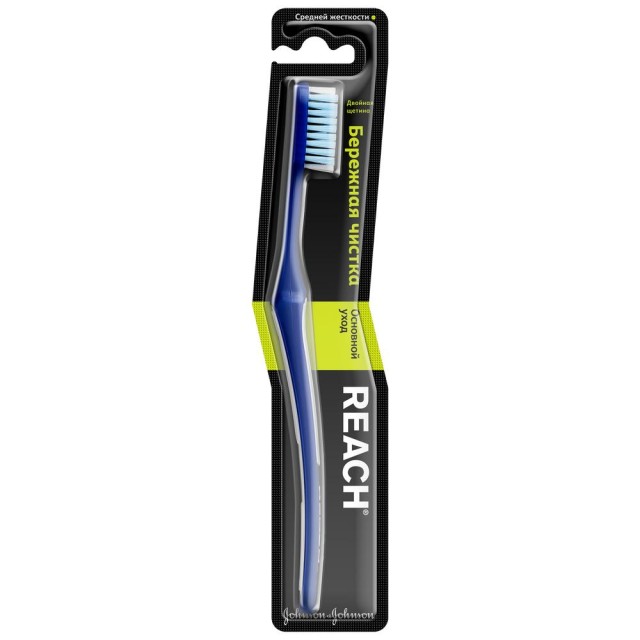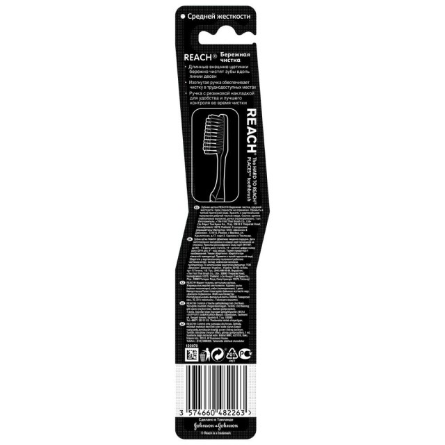 Зубная щетка REACH® «Бережная чистка» с щетиной средней жесткости имеет длинные внешние щетинки и благодаря этому позволяет более деликатно очищать зубы вдоль линии десен. Изогнутая форма ручки с резиновой накладкой обеспечивает лучшую чистку даже в труднодоступных местах, способствует удобному захвату и препятствует скольжению в руке.