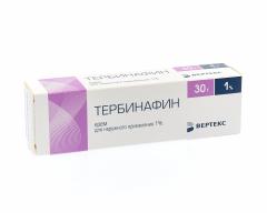 Противогрибковый препарат для местного применения, обладающий широким спектром противогрибковой активности. Даже в небольших концентрациях тербинафин оказывает фунгицидное действие в отношении дерматофитов (Trychophyton rubrum, T.mentagrophytes, T.verrucosum, T.violaceum, T.tonsurans, Microsporum canis, Epidermophyton flocco-sum), плесневых (в основном C.albicans) и определенных диморфных грибов (Pityrosporum orbicu-lare). Активность в отношении дрожжевых грибов, в зависимости от их вида, может быть фунгицидной или фунгистатической.