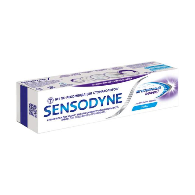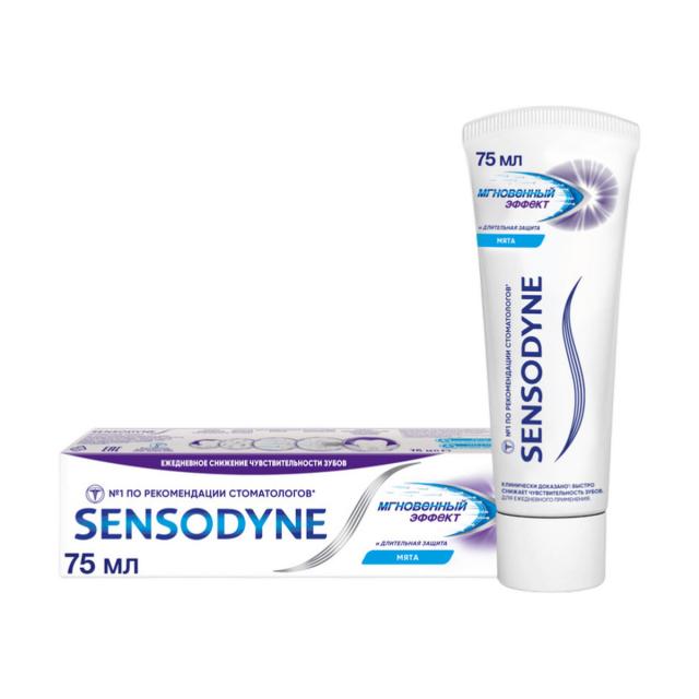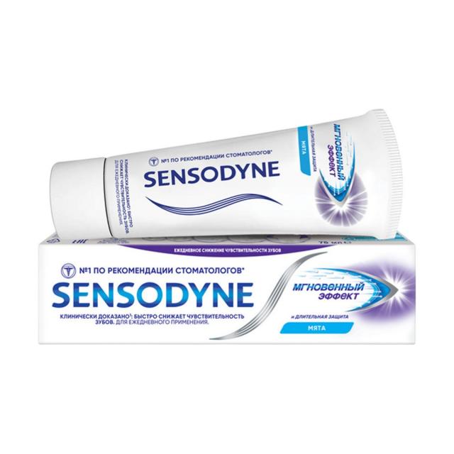 Зубная паста Sensodyne Мгновенный Эффект способствует снижению чувствительности зубов через 60 секунд после нанесения, обеспечивает мгновенное и продолжительное снижение боли при гиперчувствительности зубов, а также создает изолирующий слой на поверхности дентина и внутри дентинных канальцев. При чистке зубов 2 раза в день паста Sensodyne Мгновенный Эффект также защищает от кариеса благодаря содержанию фтора.