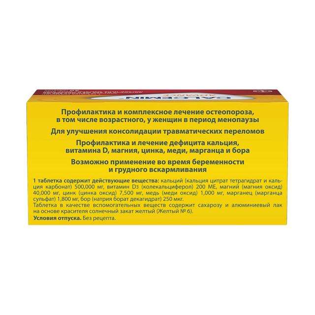 Кальций - 500 мг (кальция цитрат и кальция карбонат), Витамин D3 - 200 МЕ, магний - 40 мг (магния оксид), цинк - 7,5 мг (цинка оксид), медь - 1 мг (меди оксид), марганец - 1,8 мг (марганца сульфат), бор - 250 мкг (натрия борат).