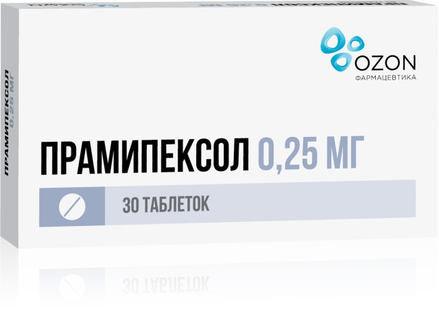 Действующее вещество: прамипексола дигидрохлорида моногидрат - 0,250 мг.