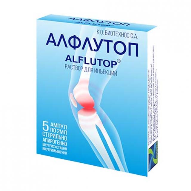 Алфлутоп - оригинальный хондропротектор, представляющий собой стандартизированный, очищенный (обезжиренный и депротеинизированный) экстракт из 4 видов морских рыб, состоящий из мукополисахаридов, хондроитина сульфата, аминокислот, пептидов, ионов натрия, калия, кальция, магния, железа, меди и цинка. Алфлутоп обладает выраженным противовоспалительным и обезболивающим действием. Препарат предотвращает разрушение макромолекулярных структур нормальных тканей, стимулирует процессы восстановления в интерстициальной ткани и ткани суставного хряща. Противовоспалительное действие и регенерация тканей основаны на угнетении активности гиалуронидазы и нормализации биосинтеза гиалуроновой кислоты. Оба эти эффекта синергичны и обусловливают противовоспалительное действие препарата и активацию восстановительных процессов в тканях, в частности, восстановление структуры хряща. Препарат хорошо переносится пациентами, в том числе, с заболеваниями желудочно-кишечного тракта и сердечно-сосудистой системы.