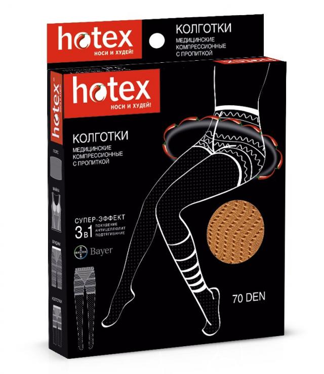 Разработанная фармацевтической компанией «BAYER» пропитка колготок HOTEX содержит в своем составе экстракт красного перца, способствующий сжиганию подкожного жира, улучшению периферического кровообращения, лимфатического оттока и обмена веществ в подкожно-жировом слое, а также вытяжку из печени глубоководных рыб, снимающую мышечную боль, и защищающий кожу от раздражения и воспаления экстракт ромашки.