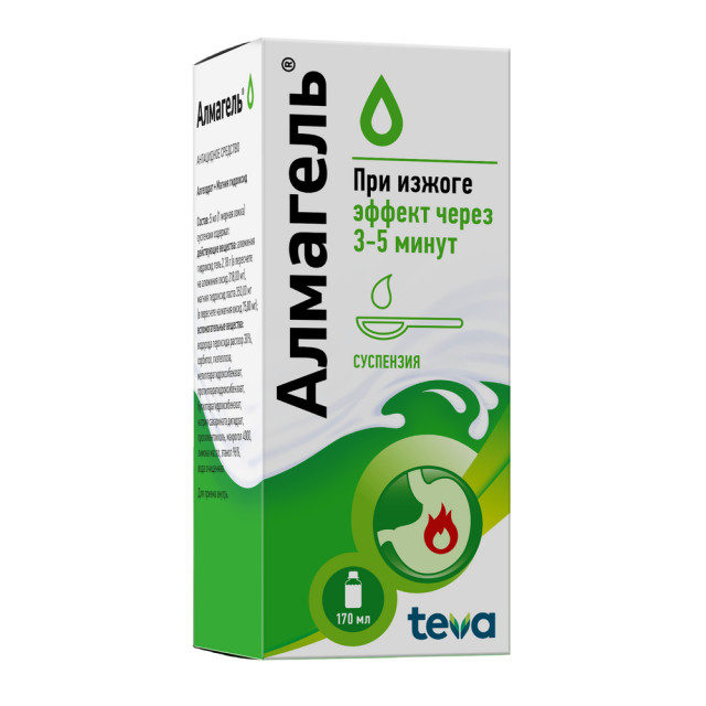 Препарат Алмагель® - лекарственное средство, представляющее собой сбалансированную комбинацию алгелдрата (алюминия гидроксида) и магния гидроксида. Oн нейтрализует свободную соляную кислоту в желудке, снижает активность пепсина, что приводит к уменьшению переваривающей активности желудочного сока. Оказывает обволакивающее, адсорбирующее действие. Защищает слизистую оболочку желудка за счет стимулирования синтеза простагландинов (цитопротективное действие). Это предохраняет слизистую оболочку от воспалительных и эрозивно-геморрагических поражений в результате применения раздражающих и ульцерогенных агентов, таких как этиловый спирт и нестероидные противовоспалительные препараты (например, индометацин, диклофенак, аспирин, ацетилсалициловая кислота, кортикостероидные препараты). Терапевтический эффект после приема препарата наступает через 3-5 минут. Продолжительность действия зависит от скорости опорожнения желудка. При приеме натощак действие длится до 60 минут. При приеме через час после приема пищи антацидное действие может продолжаться до 3 часов.