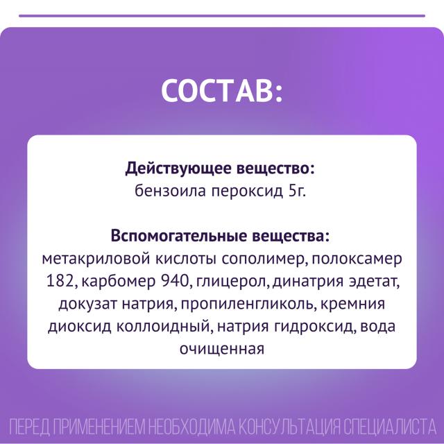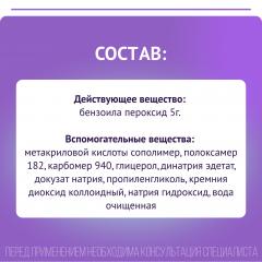 бензоила пероксид водный (в пересчете на бензоила пероксид безводный) - 2,5 г, метакриловой кислоты сополимер – 2,0 г, полоксамер 182 – 0,2 г, карбомер 940 – 0,8 г, глицерол – 4,0 г, динатрия эдетат – 0,1 г, докузат натрия - 0,05 г, пропиленгликоль – 4,0 г, кремния диоксид коллоидный – 0,021 г, натрия гидроксид – до pH 5.1-5.5, вода очищенная – до 100 г.