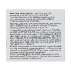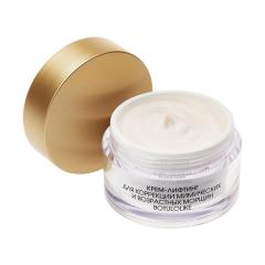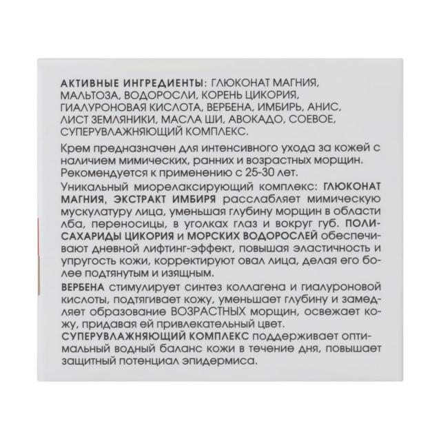 Крем мягко расслабляет мышцы лица в области лба, вокруг губ, в уголках глаз, помогая тем самым уменьшить глубину морщин и предотвращая появление новых. Действие крема идентично препаратам, используемым в косметологии для коррекции мимических морщин инвазивными методами. Но, поскольку крем наносится на поверхность кожи, действие его более мягкое и безопасное по сравнению с введением препаратов внутрь кожи. Крем-лифтинг для коррекции мимических и возрастных морщин рекомендуется для кожи, склонной к образованию морщин. Крем обеспечивает незамедлительный визуальный anti-age-эффект, оптически уменьшая неровности кожи и морщинки.
