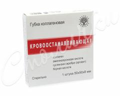 Губка коллагеновая кровоостанавливающая представляет собой стерильные прямоугольные пластины губчатой структуры, различных типоразмеров в мм: 10,010,08,0 (10,020,08,0), (50,050,08,0), (53,053,08,0), (50,0100,08,0), (97,097,08,0), (100,0100,08,0), (100,0200,08,0) желтого или кремового цвета, изготовленных методом сублимации из смеси растворов природного биополимера коллагена, аминокапроновой кислоты, арговита, борной кислоты.