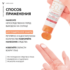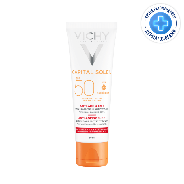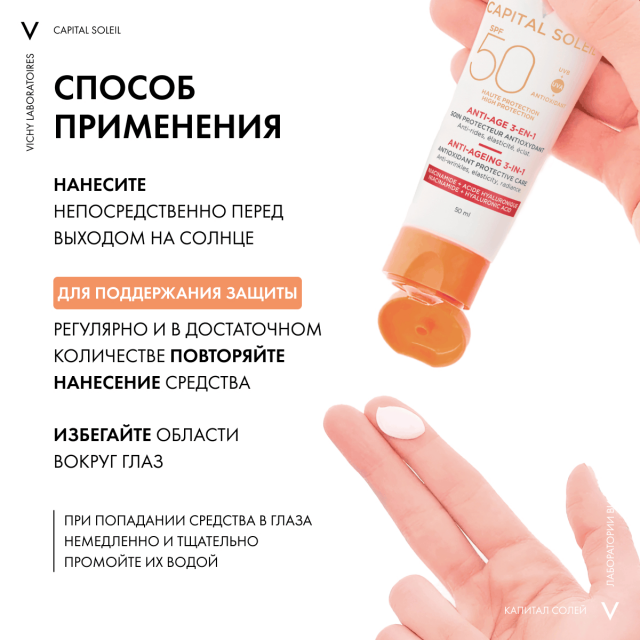 Антивозрастной уход 3 в 1 VICHY CAPITAL SOLEIL с антиоксидантами SPF 50+ – первый* солнцезащитный уход, который не только предупреждает, но и корректирует существующие признаки фотостарения. Благодаря революционной формуле* с комплексом антиоксидантов и фильтрами широкого спектра SPF 50 / PPD 20,9, средство эффективно борется с признаками фотостарения: морщинами, потерей эластичности, пигментными пятнами и отсутствием сияния кожи. Вулканическая термальная вода VICHY в составе обладает восстанавливающими и укрепляющими свойствами, стимулирует защитные функции кожи.