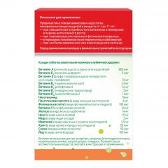 Витамин А (ретинола ацетат) - 800 мкг витамин D (холекальциферол) - 5 мкг витамин Е (DL-альфа-токоферола ацетат) - 10 мг витамин В1 (тиамина нитрат) - 1,4 мг витамин В2 (рибофлавин) - 1,6 мг витамин В6 (пиридоксина гидрохлорид) - 2 мг витамин В12 (цианокобаламин) - 1 мкг никотинамид - 18 мг пантотеновая кислота (пантотенат кальция) - 6 мг фолиевая кислота - 100 мкг витамин С (аскорбиновая кислота) - 60 мг железо (фумарат железа) - 14 мг цинк (окись цинка) - 15 мг медь (сульфат меди) - 2 мг марганец (сульфат марганца) - 2,5 мг хром (хлорид хрома) - 50 мкг селен (селенат натрия) - 50 мкг йод (йодид калия) - 150 мкг.