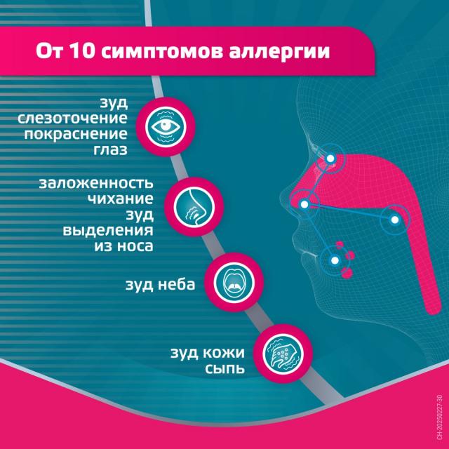 - аллергический ринит (устранение или облегчение чихания, заложенности носа, выделения слизи из носа, зуда в носу, зуда неба, зуда и покраснения глаз, слезотечения);