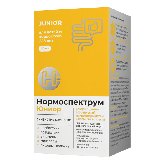 В мультикомпонентном синбиотик – комплексе "Нормоспектрум® Юниор" консорциум пробиотиков специально подобран с учетом особенностей состава микрофлоры детей и подростков в возрасте от 7 до 18 лет и содержит виды и штаммы живых бактерий (B.bifidum, В.breve, B.longum, и т.д.), которые наиболее физиологичны для детей данной возрастной группы.