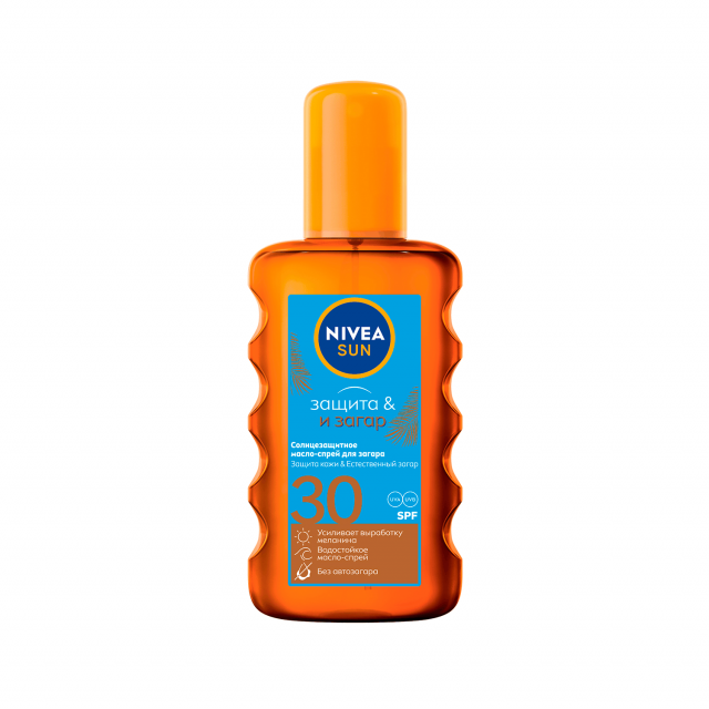 Солнцезащитное масло-спрей для загара Защита и Загар SPF 30 от NIVEA SUN обеспечивает эффективную защиту от UVA и UVB-лучей. Водостойкое - загар и защита от солнца даже в воде. Стимулирует проявление естественного загара, благодаря натуральному экстракту усиливает выработку меланина клетками кожи. Результат - красивый золотистый загар, а кожа мягкая и шелковистая. Без эффекта автозагара. Формат спрея позволяет легко нанести средство, распыляя из любого положения. Способ применения: хорошо встряхните перед использованием. Обильно нанесите на кожу за 20-30 минут до начала пребывания на солнце и дождитесь полного впитывания средства перед тем, как надевать одежду. Не распылять непосредственно на лицо. Обновляйте защитный слой регулярно, особенно после купания и вытирания полотенцем. С заботой об океане: не содержит Октиноксат и Оксибензон. Доверь защиту от солнца бренду NIVEA.