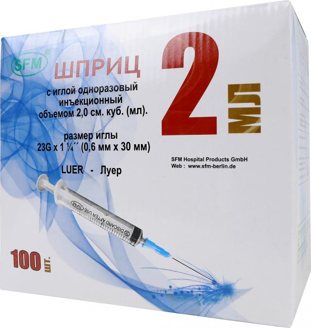 Шприц 2мл. (3-х) SFM, Германия однораз. стер. с надетой иглой 0,6 x 30 - 23G (блистер)