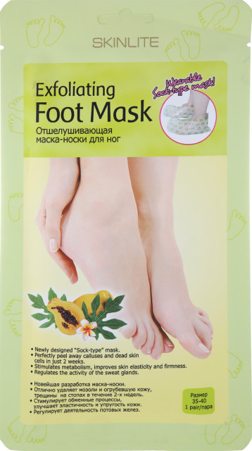 Новейшая разработка маска-носки. Отлично удаляет мозоли и огрубевшую кожу, трещины на стопах в течение 2х недель. Стимулирует обменные процессы, улучшает эластичность и упругость кожи. Регулирует деятельность потовых желез. 1 пара SKINLITE Отшелушивающая маска-носки для ног - это инновационный продукт, который сочетает в себе глубокий пилинг стоп и долговременный оздоравливающий эффект. Это эффективное средство для удаления мозолей, натоптышей и потрескавшейся кожи на стопах, предотвращающее огрубление кожи и образование новых трещин. Гликолевая и цитрусовая кислоты способствуют безболезненному и естественному удалению отмерших клеток. Натуральные экстракты папайи и яблока оказывают смягчающее, увлажняющее и восстанавливающее действие. Экстракт ромашки успокаивает кожу. Форма маски в виде носков делает процедуру простой и приятной. Уже через 7 дней кожа Ваших ног станет гладкой и нежной, как у младенца, а полученный результат сохранится на 2-3 месяца. универсальный размер - 35-41