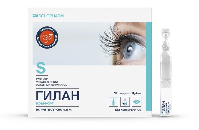 Раствор увлажняющий офтальмологический Гилан Комфорт воспроизводит действие естественной слезы, защищает и увлажняет поверхность глаза и смазывает ее. Это средство оказывает долговременное облегчающее действие при сухости глаз, обусловленной различными факторами:
