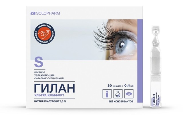 При систематическом ношении контактных линз рекомендуется применение офтальмологического раствора Гилан Ультра комфорт, который способствует длительному увлажнению глаза, так как его действие идентично натуральной слезной жидкости. Офтальмологический раствор Гилан Ультра комфорт не содержит консервантов, поэтому отсутствует нежелательное токсическое действие на ткани глаза. Раствор имеет показатель вязкости 9,0 - 18,0 мПа·с.
