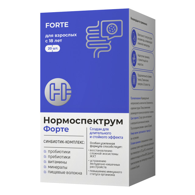 "Нормоспектрум®- Форте" способствует восстановлению нормальной микрофлоры кишечника, улучшению функционального состояния желудочно-кишечного тракта и повышению защитной функции иммунной системы взрослых с 18 лет.
