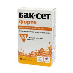 Универсальность применения при различных нарушениях пищеварения и аллергии у детей старше 3-х лет и взрослых. У различных видов пробиотиков в разной степени выражены те или иные полезные свойства. Один единственный вид не в состоянии справиться с разнообразными нарушениями пищеварения. Поэтому в состав Бак-Сет форте входят 14 видов пробиотиков, которые взаимно дополняют действие друг друга.