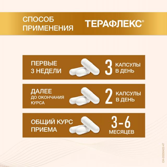 Вы можете принимать препарат Терафлекс® вне зависимости от приема пищи, при необходимости капсулы можно запить небольшим количеством воды.