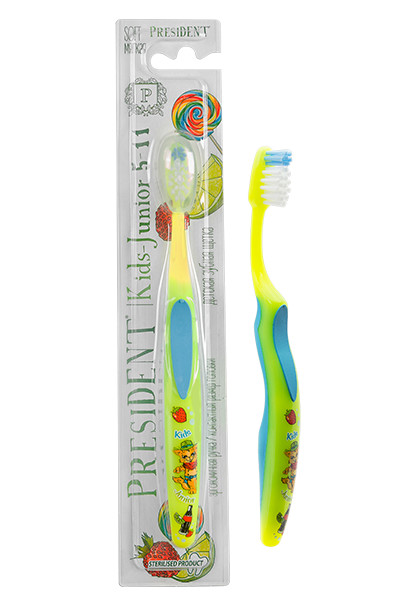 President Kids-Junior - детская зубная щетка от 5-11 лет. Мягкая щетина. Компактная головка щетки идеально подходит для чистки детских зубов. Градуированные мягкие щетинки с закругленными кончиками эффективно очищают зубы и межзубные промежутки. Удобная форма ручки позволяет надежно держать щетку во время использования