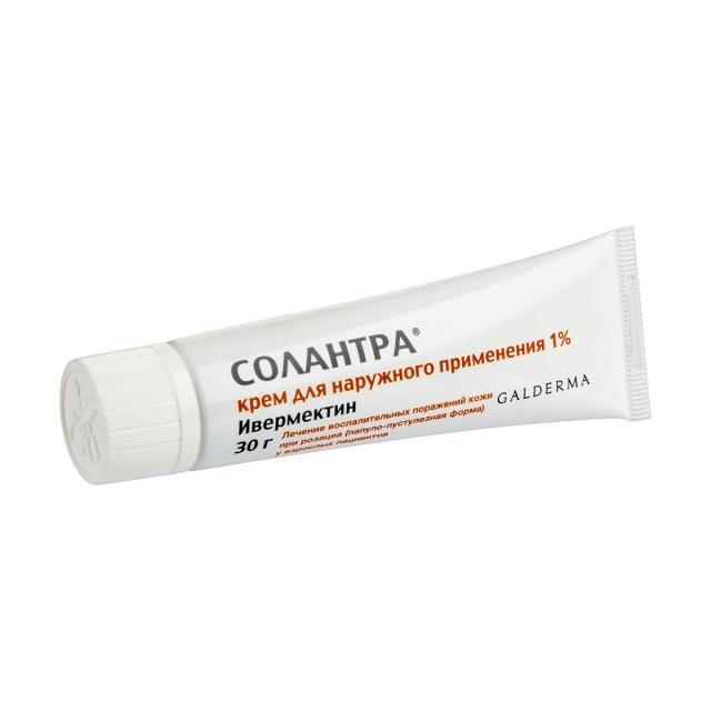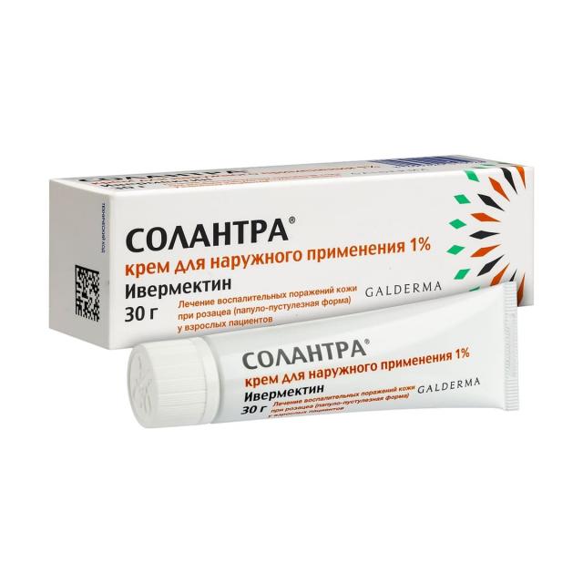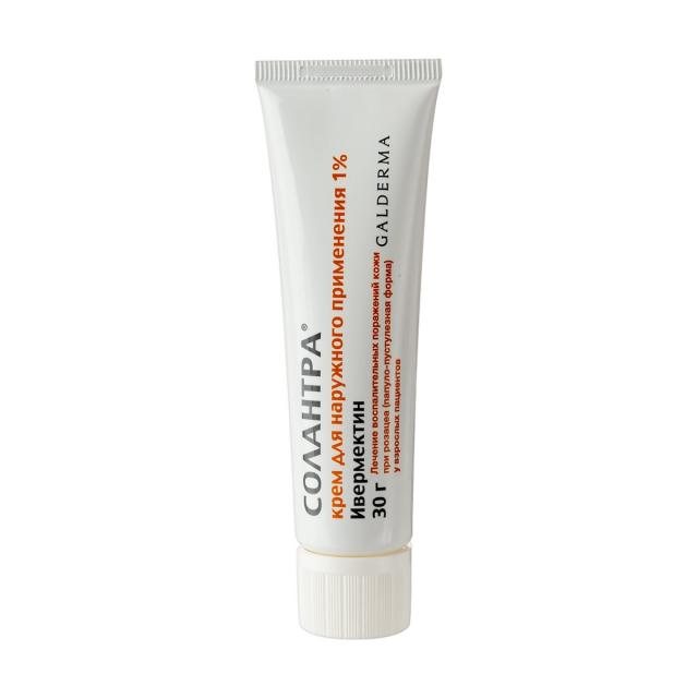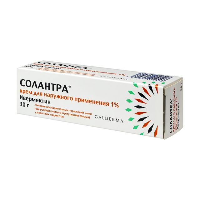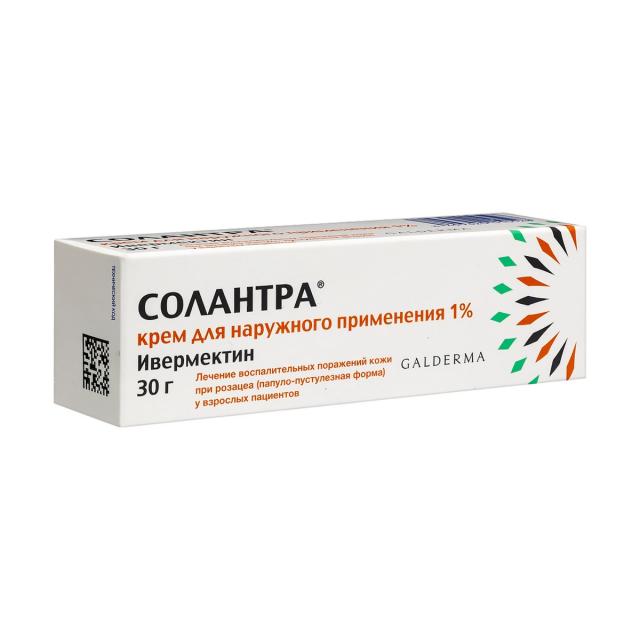 Препарат Солантра содержит действующее вещество – ивермектин. Ивермектин обладает противовоспалительным действием, способен вызывать гибель клещей Demodex, которые являются причиной воспаления кожи при розацеа. Препарат Солантра показан для лечения воспалительных поражений кожи при розацеа.