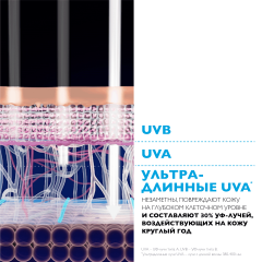 Очень высокая степень защиты. Защита от широкого спектра UV-лучей. Инновационный* UV-фильтр: Mexoryl 400 защищает от ультрадлинных UVA-лучей (380-400 нм), которые незаметны, повреждают кожу на глубоком клеточном уровне и составляют 30% УФ-лучей, воздействующих на кожу круглый год.