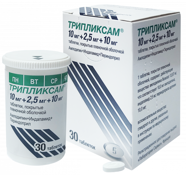Трипликсам® - комбинированный препарат, включающий в себя три антигипертензивных компонента, каждый из которых дополняет действие других по контролю АД у пациентов с артериальной гипертензией. Амлодипин - блокатор "медленных" кальциевых каналов (БМКК), производное дигидропиридина, индапамид – сульфонамидный диуретик, периндоприла аргинин - ингибитор фермента, превращающего ангиотензин I в ангиотензин II (ингибитор АПФ).