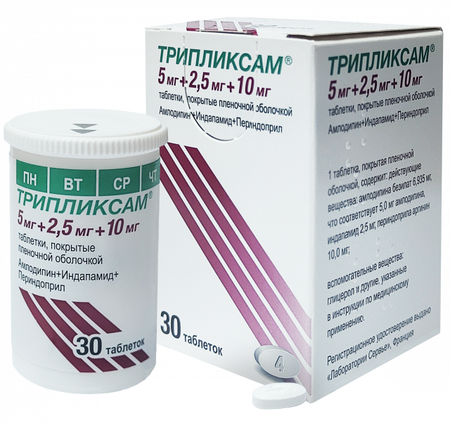 Трипликсам® - комбинированный препарат, включающий в себя три антигипертензивных компонента, каждый из которых дополняет действие других по контролю АД у пациентов с артериальной гипертензией. Амлодипин - блокатор "медленных" кальциевых каналов (БМКК), производное дигидропиридина, индапамид – сульфонамидный диуретик, периндоприла аргинин - ингибитор фермента, превращающего ангиотензин I в ангиотензин II (ингибитор АПФ).
