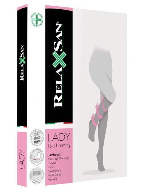 Гольфы Relaxsan LADY (арт. 950A) - с компрессией 15-21 мм. рт. ст., 1 класс. Компрессионные гольфы полупрозрачные с мягкой эластичной резинкой, укрепленным мыском и пяткой, с массажной стелькой. С матирующим эффектом, позволяют скрыть сосудистую сеточку. Анатомическая форма обеспечивает удобство и хорошую фиксацию изделия.