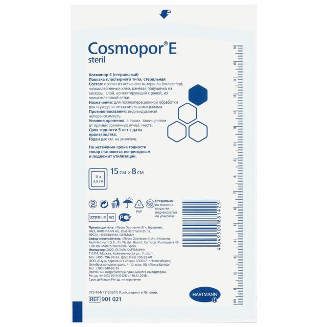 Повязки пластырного типа стерильные Cosmopor E Steril/Космопор Е Стерил - стерильная самоклеящаяся повязка на рану с впитывающей подушечкой для ран с умеренной экссудацией, каждая повязка упакована индивидуально.