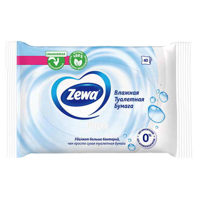 Влажная туалетная бумага Zewa Pure является отличным дополнением к сухой туалетной бумаге и специально разработана для деликатного очищения. Она удаляет больше бактерий, чем просто сухая туалетная бумага*, и с ней вы можете ощущать чистоту и свежесть в любое время.